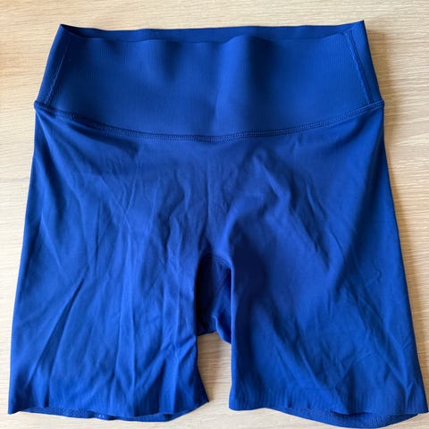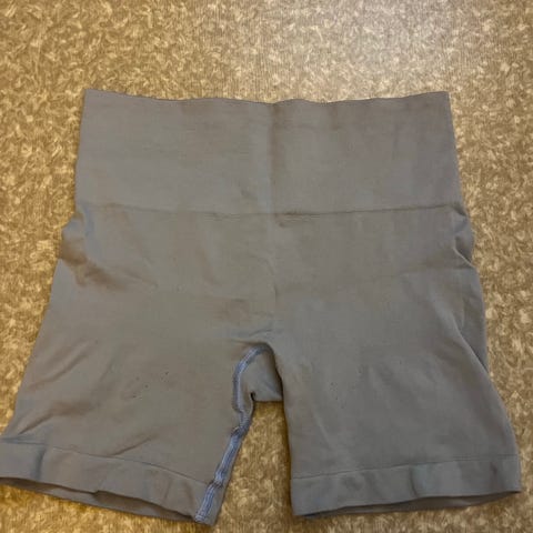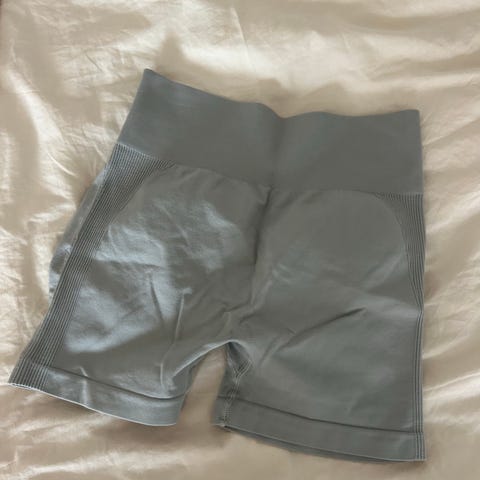 treningsshorts for dame i størrelse M. Shortsen er i en grå farge og har høyt liv. Den er laget i et elastisk, tettsittende materiale som gir god bevegelsesfrihet, egnet til fitness og annen trening. Lengden går til midt på låret, og baksiden har rynkedetalj. Passer til bruk på treningssenter, hjemmetrening eller annen fysisk aktivitet.