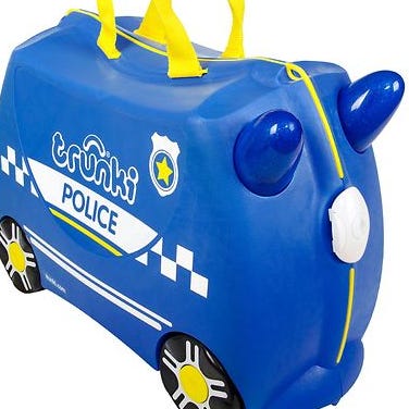 Trunki -kofferten har et design ride med hjul og en lang, avtakbar stropp, slik at du kan dra barnet eller la dem kjøre selv gjennom de lange strekningene på flyplassen. Det er to horn foran som barnet kan holde seg Fast i. Kofferten består av et stort rom med elastiske stropper og en liten pose for å holde ting på plass. Den lukkes med et smart klikksystem og har en låsefunksjon. Det er også praktiske stropper på toppen når kofferten skal bæres. Kofferten har gummilister på alle kanter, slik at små fingre ikke blir klemt.