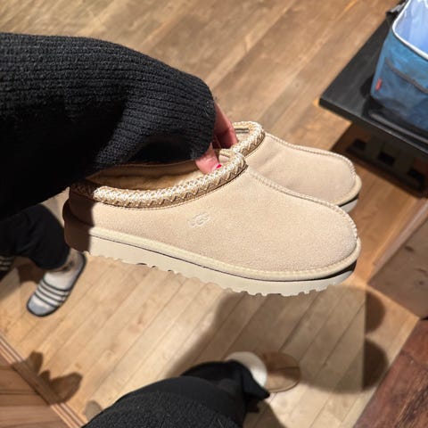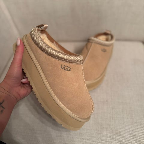 UGG tøfler i størrelse 38 i beige farge. Modellen har lukket tå, lav hæl og kraftig yttersåle med mønster for bedre grep. Overdelen er i mykt materiale med dekorativ kant øverst. Egnet som innetøfler eller lette sko til hverdagsbruk i tørt vær.