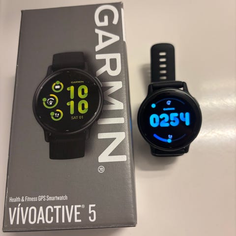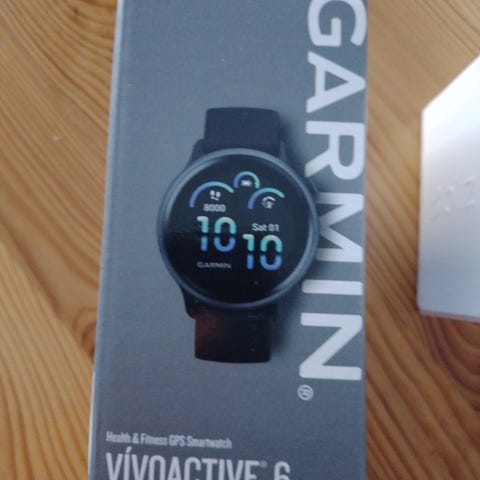 Garmin Vívоactive 5 smartklokke i svart. Klokken har rund skjerm og er utviklet for bruk til aktivitet og trening, med innebygd GPS og funksjoner for helse- og fitnessmåling. Leveres i original eske slik den fremstår på bildene.