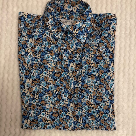 Selger en meget pen og stilfull skjorte fra det svenske kvalitetsmerket John Henric. Skjorten har et detaljert blomstermønster i ulike blåtoner, noe som gir et friskt og sofistikert uttrykk.