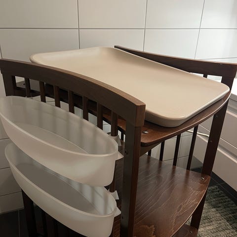 Praktisk og fleksibelt stellebord på hjul. Tidløst design og god plass til oppbevaring av babyens ting i en skuff og to åpne hyller.