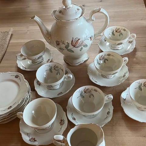 Serviset er i pent brukt stand. Ingen skår eller sprekker. Normal, lett slitasje på gullkant.Kaffekanne er som ny.