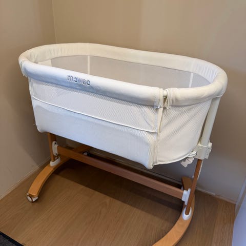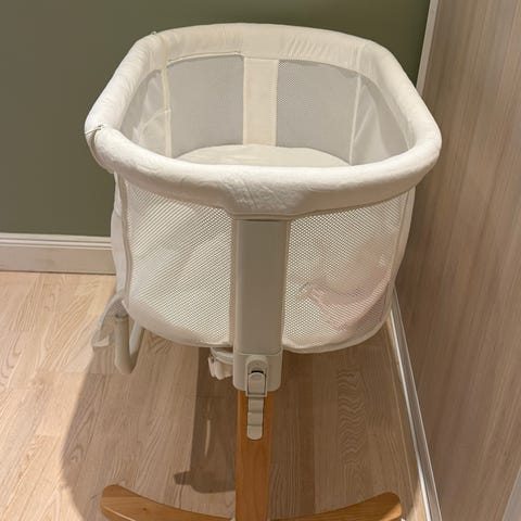 Den ene bøylen (nederst på bildet fra nettsiden)er kastet og følger ikke med da vi aldri forstod hva den var til. Stroppene til å feste rundt foreldresengen følger heller ikke med da de heller ikke ble brukt.