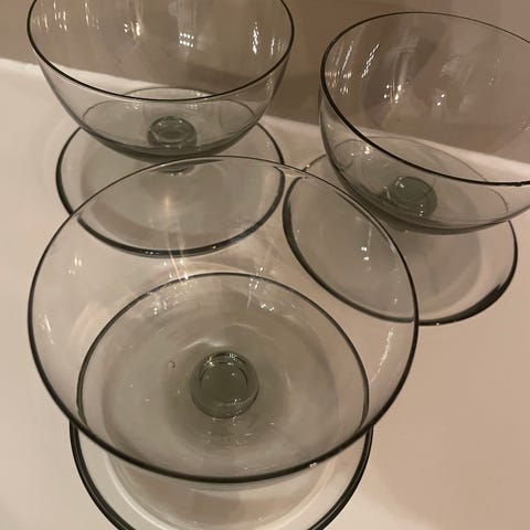 Hadeland Glassverk dessertskåler i glass med svakt grønnfarget kant og fot.