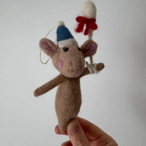 Nålefiltede ekorn med avtagbare gule og røde luer. Høyde ca 23 cm.