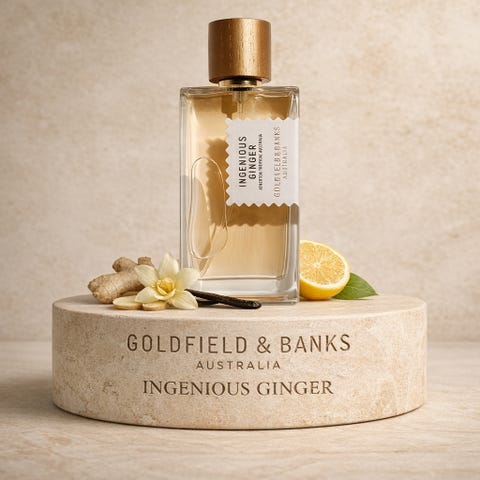 "Goldfield & Banks Ingenious Ginger er en unisex parfyme. Duften har sitrus- og krydrede hovedtoner, kombinert med blant annet ingefærblomst, sitron og bergamott i toppnotene. Hjertenotene inkluderer mandarinappelsin, magnolia, sjasmin og rose. Basen består blant annet av vanilje, amber, sandeltre, cashmeran, musk og patchouli. Passer både kvinner og menn som ønsker en sitruspreget og krydret duft med florale og varme, treaktige nyanser"