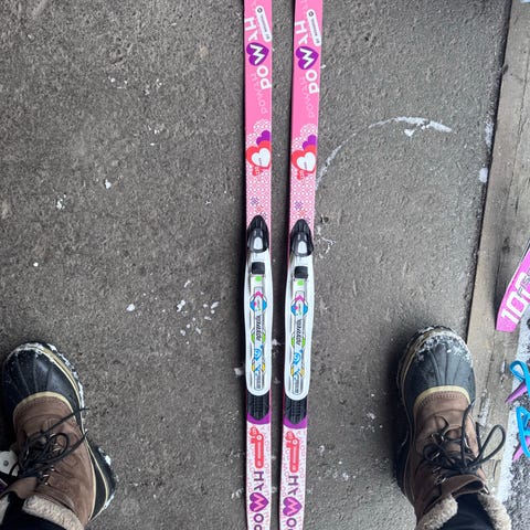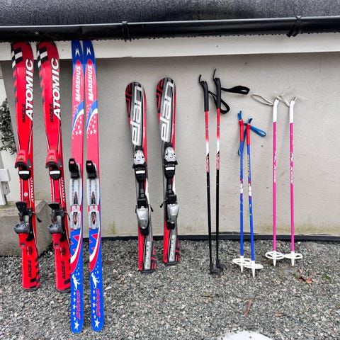 Rød/blå Dino selges billigere da skiene ikke er helt hele lenger, men fungerer fint fortsatt, se bilder.