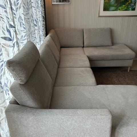 Scapa 3-seter sofa med sjeselong og puff. Sofaen har ryggstøtte som kan heves/senkes etter ønske. Se bilder for hvordan den ser ut med ryggstøtten både senket og hevet. Puffen har noen få bruksmerker. Ellers i veldig god stand. Må hentes