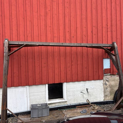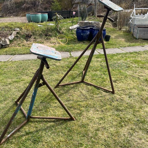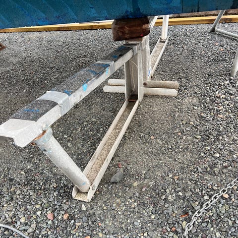 Båtvugge i metall med justerbare armer. Vuggen er konstruert for å støtte skrog på mindre båter under lagring eller vedlikehold. Rammen står på en fast base, og armene kan vinkles for å tilpasses ulike skrogformer. Egner seg til bruk på fast underlag som grus eller asfalt, for stabil oppbevaring av båt utenfor vannet.