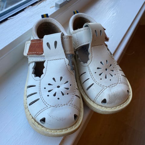 Kavat sandaler i str 23 for barn, unisexmodell. Åpne sandaler i mørkeblått skinn med kontrastsømmer og brune detaljer ved hælen. Justerbar borrelås over vristen for enkel tilpasning. Myk innersåle og fleksibel yttersåle i gummi med mønster for bedre grep. Egnet som sommersko eller innesko for barn.