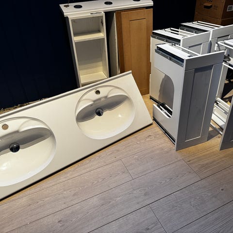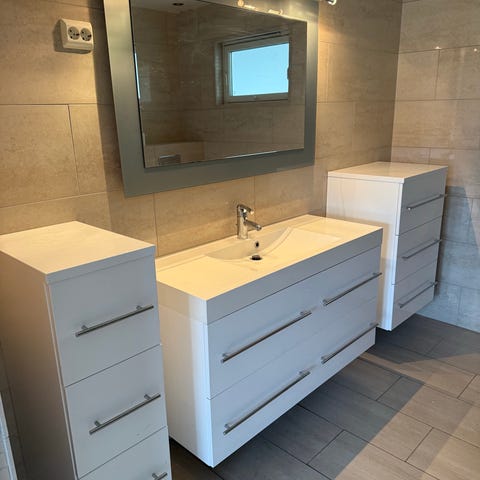 Selger unna komplett servant med kran (100cm) høyskap(35cm) og speil(100cm) følger også med. Blir demontert slik at det er greit og montere igjen😊