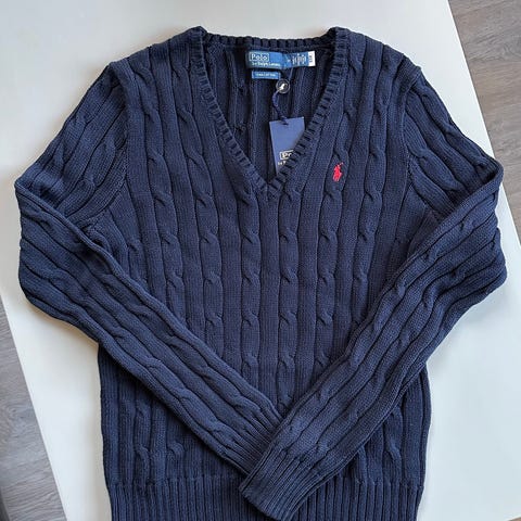 Polo Ralph Lauren genser for dame i størrelse XS. Genseren er blå og strikket i bomull med kabelstrikket mønster. Den har rund hals, lange ermer og ribbestrikkede kanter nederst og på ermene. Passer som en lett og behagelig hverdagsgenser i bomull.