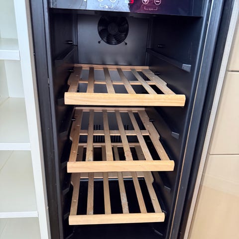 Skapet har flere uttrekkbare trehyller til horisontal lagring av vinflasker. Fronten har mørk glassdør som gir innsyn til flaskene, og det er innvendig belysning nederst i skapet. Egnet for lagring og temperering av vin i hjem, leilighet eller hybel. Passer som frittstående enhet mot vegg eller integrert i kjøkkenløsning der det er plass til et separat vinskap. 180 høyt, og 2 temperatur soner. Låsbart fra Temptech. Ny pris ca 25.000