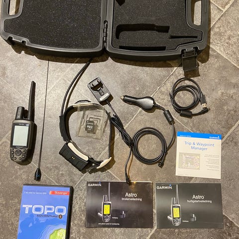 Selger Garmin Astro GPS med hundehalsbånd, komplett med original koffert, lader og tilbehør. Dette er en utgått Garmin-modell, men fortsatt populær og ettertraktet blant hundefolk og jegere.