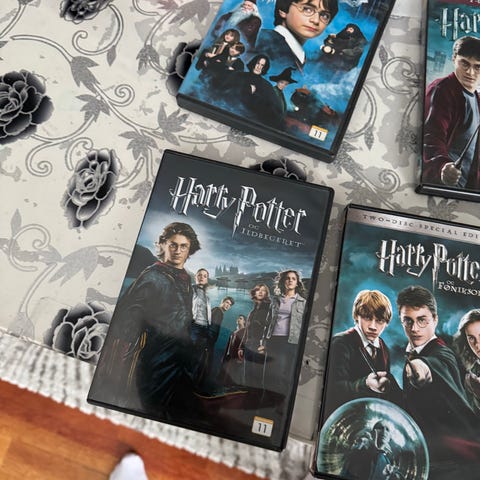 Har dei 6 første filmene til salgs. Harry Potter filmserie DVD samling med norske omslag og norsk tekst. Bildene viser flere av filmene i serien, blant annet «Harry Potter og De vises stein» og «Harry Potter og Mysteriekammeret». Filmene er utgitt på DVD-format og leveres i standard plastomslag. Egner seg for avspilling på DVD-spillere som støtter regionen angitt på platene. Passer for de som ønsker Harry Potter-filmene i fysisk DVD-format med norsk språkvalg og undertekster der dette er tilgjengelig på utgivelsen.