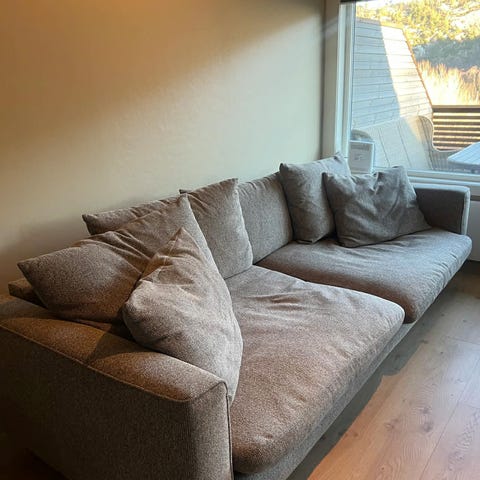Sofaen gis bort siden jeg har kjøpt en annen. Det har noen merker på en side pga katt som klor på den.