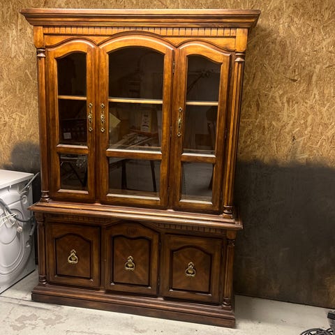Vitrineskap i tre med øvre del i glass og nedre del med skuffer og skapdører.