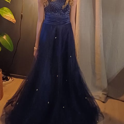 Ball kjole dom passer str 164-XS. Kjolen er sydd inn og opp for å gjøre den mindre. Passer jente 12 år str 158-164 (første bildet). Dette er sydd på en måte som enkelt kan sprette opp for å gjøre kjole litt større igjen. Det er også sydd på smale skulderbånd som enkelt kan taes bort.