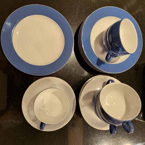 Pent servise. Og i god stand. Ingen synlige skavanker. 5 kopper, 6 fat og 6 tefat