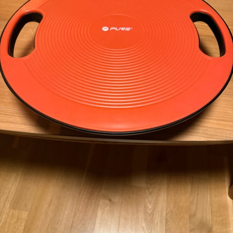 Rundt balansebrett i svart plast. Brettet har mønstret overside for bedre fotfeste og forhøyet midtpunkt under for å gi ustøtt underlag. Egnet til balanse- og stabilitetstrening, opptrening etter skade og generell styrking av ankler, knær og kjernemuskulatur. Kan brukes hjemme, på kontoret eller på treningsrom.