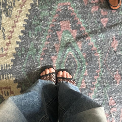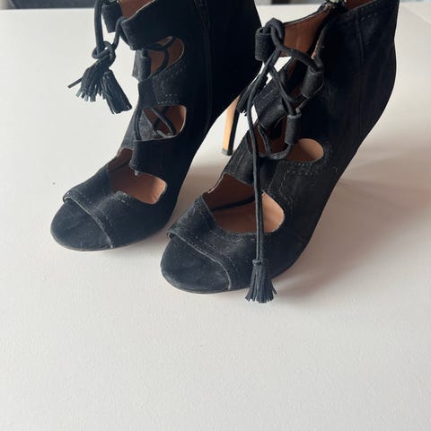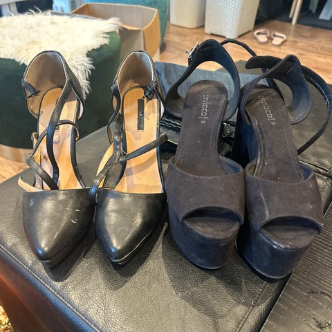 H&M hæler i størrelse 38. Skoene er svarte med to brede, flettede remmer over foten og åpen tå. De har middels høy hæl og firkantet tupp.