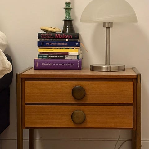Selger IKEA sitt nattbord i serien Vikhammer. Det er et fint og praktisk nattbord som har skuff med "soft close". Praktisk hylle under skuffen. Noen bruksmerker, men fungerer godt som det skal. Se siste bilde for alle målene. Nypris på IKEA er kr. 895,-.