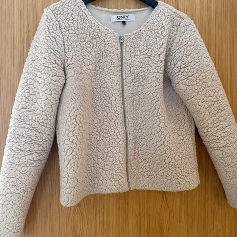 ONLY jakke for dame i størrelse L. Jakken er beige med strukturert, teddy-lignende overflate. Modellen har rund hals og glidelåslukking foran. Passer som lett ytterjakke eller som et lag over andre plagg i hverdagen.