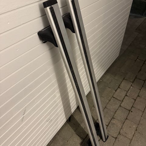 Takstativ med to aluminiumsbøyler i sølvfarge med sorte endestykker og festemekanismer. Bøylene er beregnet for montering på bilens tak og kan brukes som base for ulike typer taklast, som takboks eller sykkelstativ, innenfor produsentens anbefalte vektbegrensning. Festene har fjær- og klemmemekanisme i metall og plast. Egner seg for biler som er kompatible med denne typen universelle takstativbøyler; mål og spesifikk bilmodell tilpasning bør kontrolleres av kjøper før bruk. Er blitt brukt på Audi Q5.