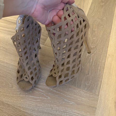 Bianco hæler i størrelse 38. Skoene er svarte med utskåret mønster og åpen tå. De har høy, smal hæl og glidelås bak på hælen for enkel av- og påtagning.
