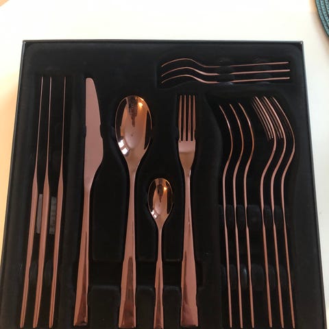 Modern house bestikk. Sonen min vann dette på basar, og meinte det var ein rar gevinst for eit barn… Vi har nok bestikk og kan no velge mellom å lagre det i 10-15 år eller håpe på at han får nokre kroner for det og kan kjøpe seg noko anna. Det er ubrukt og kostar ordinært 3500kr. Nettbutikk har det til 50% så difor legg vi oss litt under det.