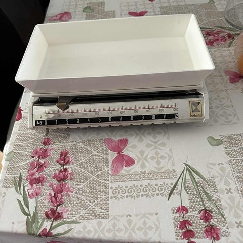 Aanonsen kjøkkenvekt mekanisk 10 kg i hvitlakkert metall. Vekten har analog skala fra 0 til 10 kg med tydelig inndeling i kilo og gram. Avtakbart rektangulært brett i metall for veiing av matvarer eller andre gjenstander. Mekanisk justeringsarm for nullstilling. Egnet som funksjonell kjøkkenvekt eller som bruks- og dekorasjonsgjenstand.