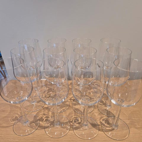 12 stk. rødvinsglass, 45 cl. selges, helst samlet, men kan selges 6 og 6. Kjøpt i 2025, aldri brukt.
