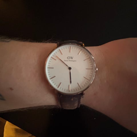 DW klokke med klassisk urskive. Brun skinnreim som kan byttes med stripete. Klokken trenger nytt batteri. Den er i god stand, bruksmerker på skinnreim.