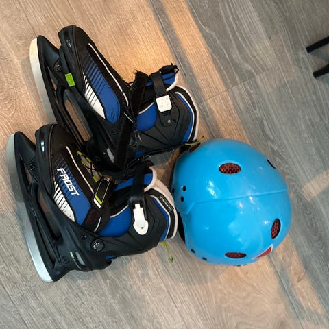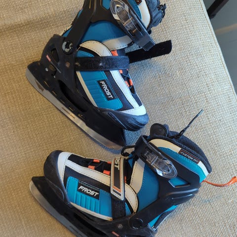 Frost skøyter for barn i blå, svart og hvit farge. Modellen har justerbar plaststøvel med spenner og lisser for god tilpasning rundt foten. Overdelen er i syntetisk materiale med polstret innside for økt komfort. Egnet til bruk på isbaner og til generell lek på is for barn.