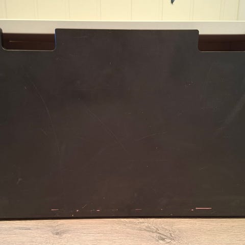 Kommode med 5 skuffer i svart farge. Skuffene har utsparinger i front som fungerer som håndtak. Passer til oppbevaring på soverom eller kontor. Overflaten er litt slitt ettersom pulten har ligget på (brukt som ben på den ene siden)