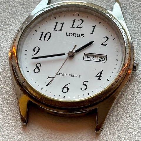 Elastisk reim, tres på hånden. Lorus urskive med dato ved 3-tallet. Batteri må byttes.