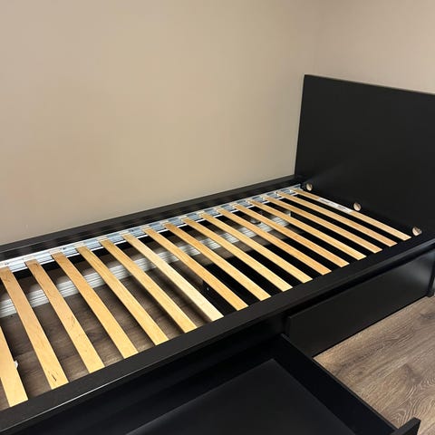 IKEA seng med skuffer i hvit utførelse. Sengen har integrerte oppbevaringsskuffer under liggeflaten, som gir ekstra lagringsplass for for eksempel sengetøy eller klær. Passer som enkeltseng på soverom, barnerom eller gjesterom. Madrass følger med. Kan trekkes ut til dobbeltseng.