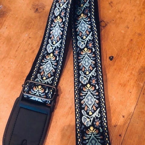 Gitarreim i regnbuefarget nylon. Reimen festes i standard festehull på gitaren. Justerbar lengde for tilpasning til ulike spillestillinger.