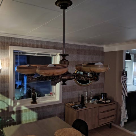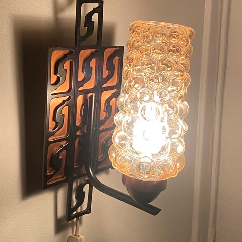 2 stk vegglamper . Lampene er laget i støpejern med skjermer av glass. Ledningene er ujordet så den må byttes