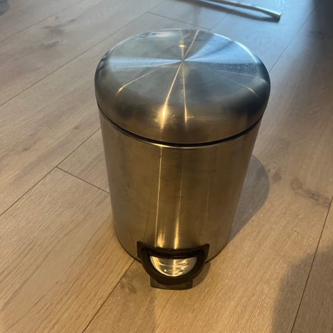 Pedalbøtte i sølvfarget metall med rundt lokk og sort pedal. Innvendig uttakbar plastbøtte for enklere tømming og rengjøring. Passer for bruk på bad, kjøkken eller kontor der det er behov for en mindre avfallsbøtte.