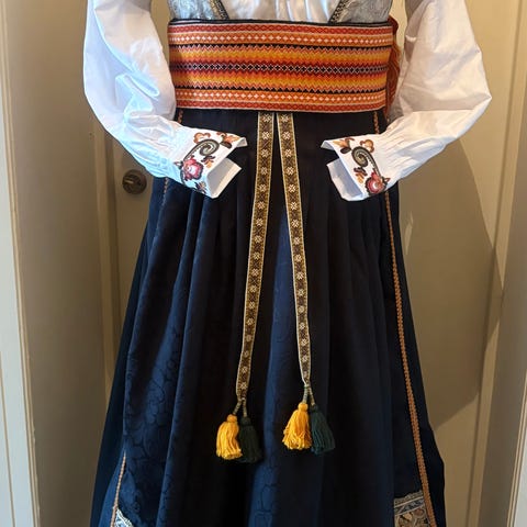 Nydelig Beltestakk i blå farge. Forkle og vest er brodert i mønsteret «Bunadsboka». Brodert skjorte i lin eller bomull. Ulike skjortebroderier kan velges. Brikkevevd belte, grindebånd fra Møre Bånd. Bunaden monteres etter mål. Bånd, skjorte og belte velges etter ønske.