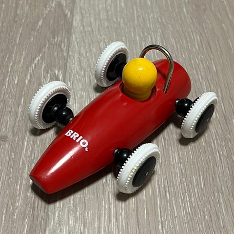 BRIO brannbil lekebil i rød plast. Lekebilen har bevegelig gul stige på toppen og medfølgende brannmannfigur i førersetet. Bilen har detaljer som slange, verktøy og førstehjelpskoffert på sidene, samt hjul som ruller. Bilen har lydeffekter.