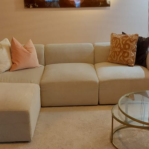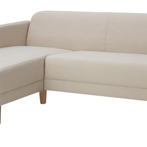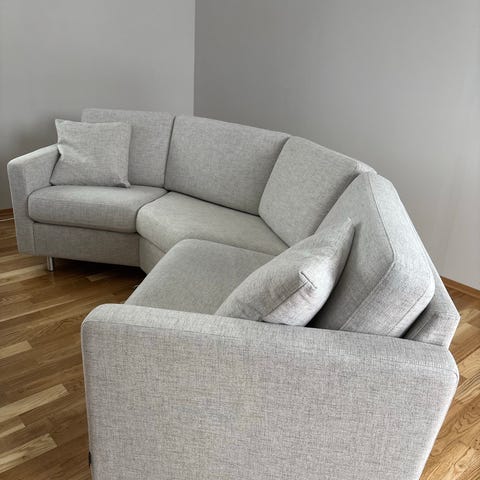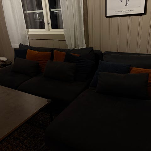 Selger en pen brukt fireseter sofa med sjeselong på venstre side. Trekkene kan vaskes. Putene i både rygg og sete er fortsatt gode. Svarte bein.