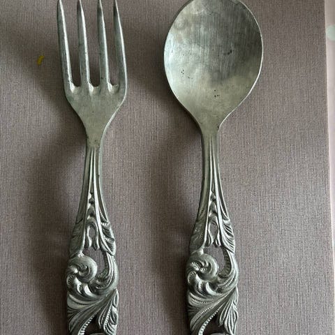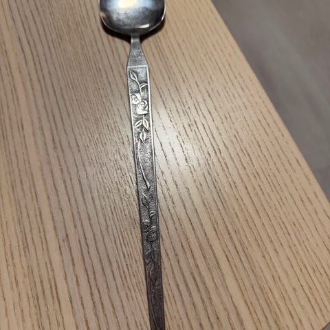 Skje i tinn med dekorert skaft. Skaftet har utsmykkede, organiske mønstre langs hele lengden. Skjeen har rund skål og preg/merke på baksiden av skaftet. Egnet som serveringsskje eller til borddekking.