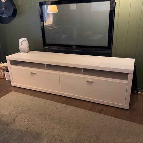 Tv benk, mangler en skrue i ene døren som gjør at den er skeiv. Sette inn skruen å skru alt rett så blir den fin igjen. Må hentes