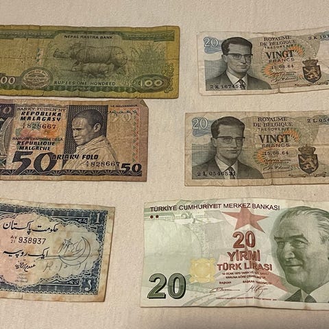 Samling med norske og utenlandske pengesedler i ulike valører og utgaver. Bildene viser blant annet sedler fra Norges Bank, samt sedler fra flere andre land i forskjellige størrelser, farger og design. Egner seg som grunnlag for samling, sortering eller videre numismatisk registrering. Antall sedler og pålydende fremgår av bildene.SELGES KUN SAMLET. Porto er inkludert i prisen