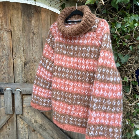 Str M. Myk, lett og varm genser strikket etter Holzweiler/Skappel-mønster «Røys». Skappel garn Myk i lammeull i lys blå bunnfarge og blå og oransje mønsterfarge. Lengde 68 cm, omkrets 112 cm, ermelengde 43 cm.