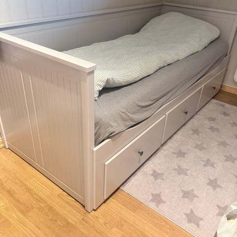 Seng med uttrekkbar seng selges for 700,-. Noen hakk i lakken.