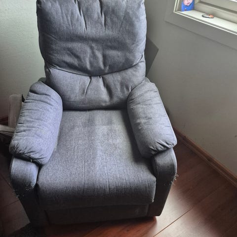 Selger en grå lenestol med recliner-funksjon. Stolen er ca. 2 år gammel og har vært brukt i et hjem der den har gitt god komfort. Den er i god stand, og fungerer som den skal.